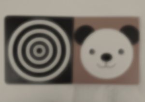 Vi har tagit en bild av en barnbok. Här simulerar vi hur en 10 veckor gammal bebis ser. Det visar med all tydlighet vad det handlar om när man ska välja böcker till en nyfödd.