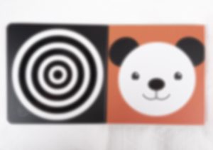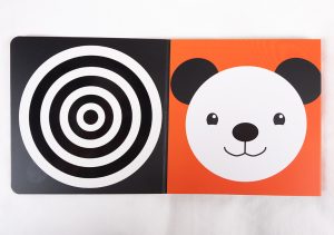 Som du ser är detta en bok där den nyfödda kan uppfatta motiven ganska bra. Det är för att illustratören använt tydliga kontraster när det gäller både färger och figurer.